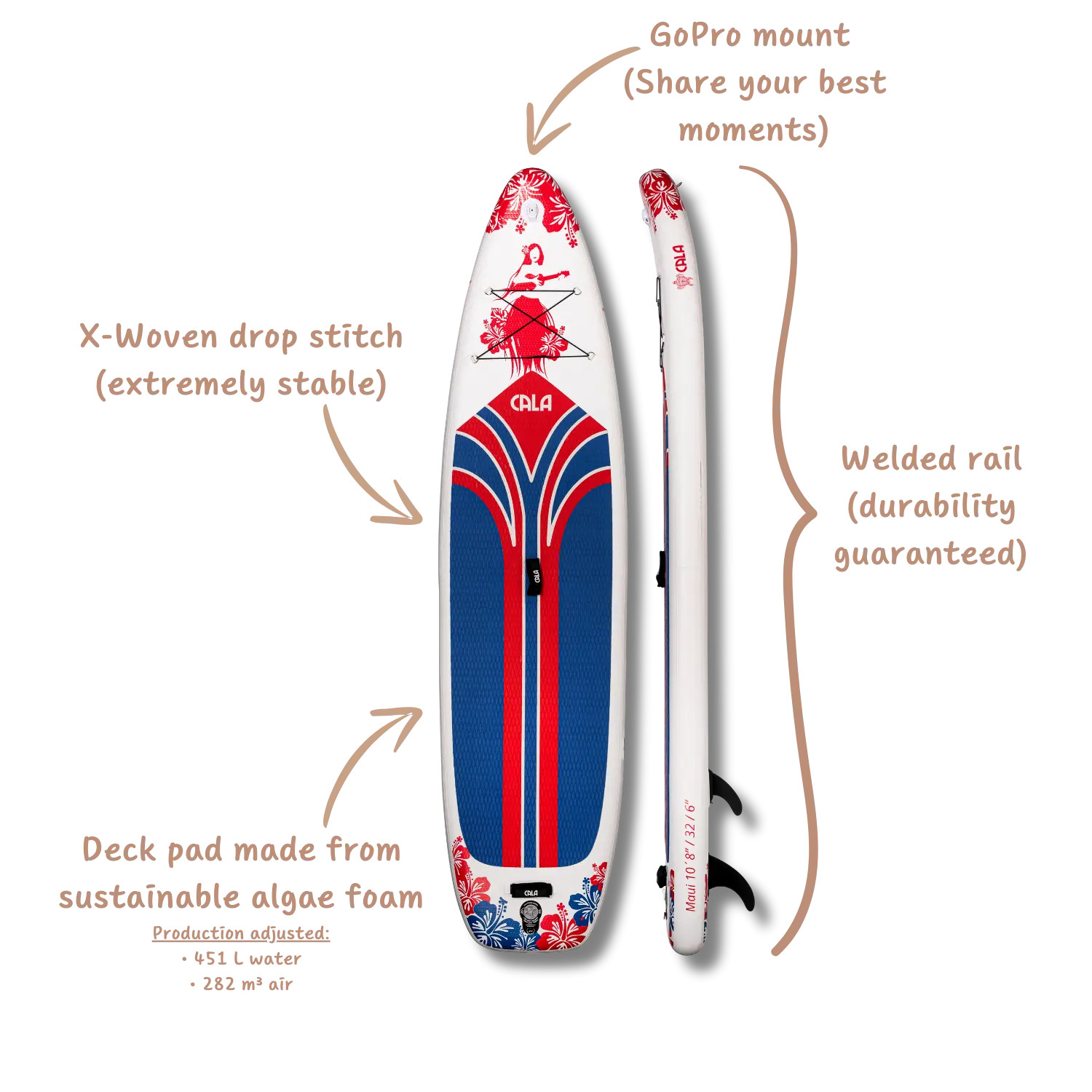 Maui is the ideal board for beginners and advanced riders. It glides easily, remains stable in the water, and allows you to safely bring children or dogs on the lake or calm sea.
