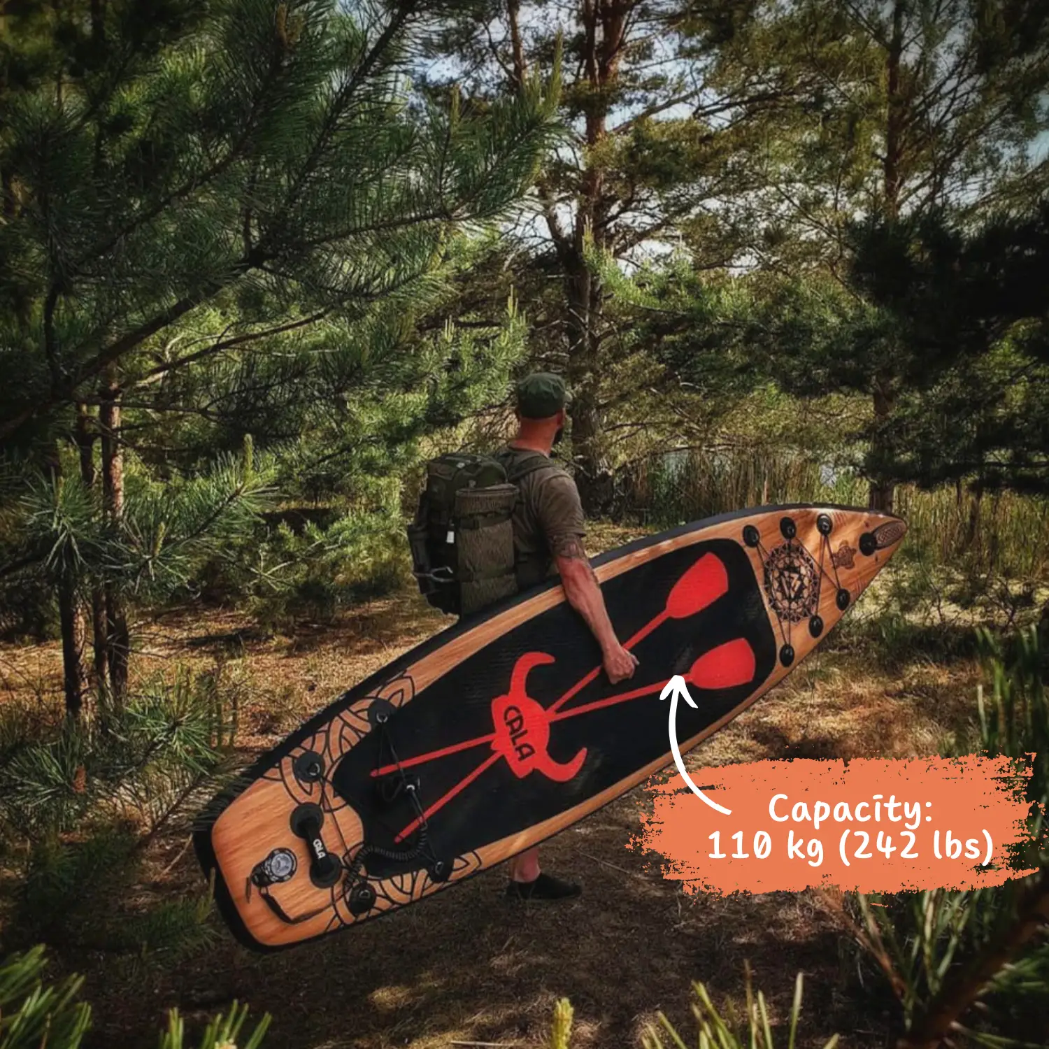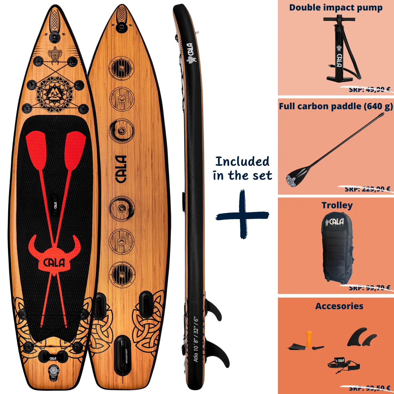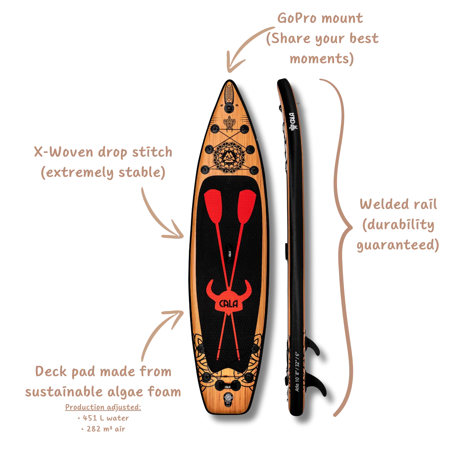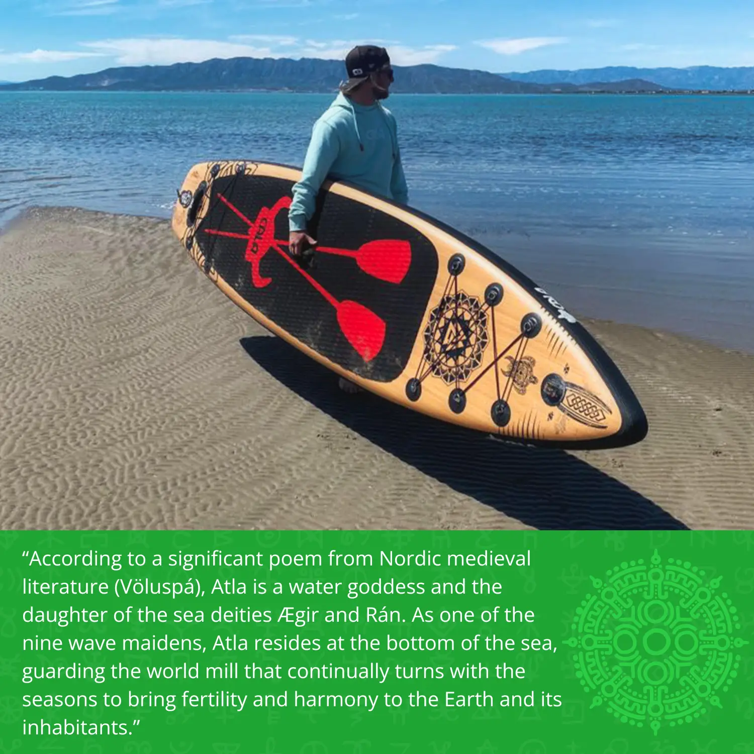 The Atla board is part of our Touring series and is ideal for use in the sea and ocean. Thanks to the Point Nose design, it cuts through waves very well. It's relatively short, making it easy to maneuver even in choppy waters. Therefore, we consider it a successful blend of a touring and all-round board. The black surf pad features a blood-red Viking helmet with two paddles, igniting courage and a spirit of adventure within you.