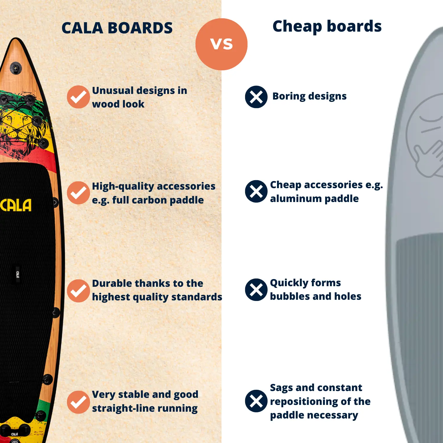 At CALA, we prioritize quality and sustainability. Cheaper boards may seem cheaper at first, but often end up as waste early on, which is both frustrating and harmful to the environment.