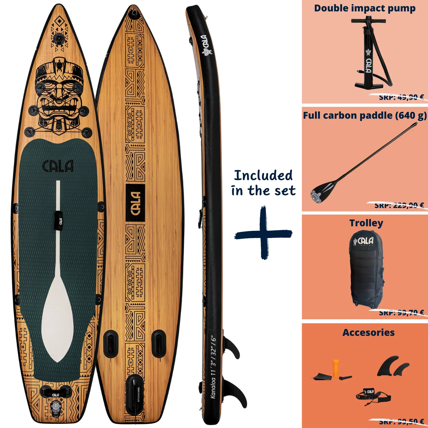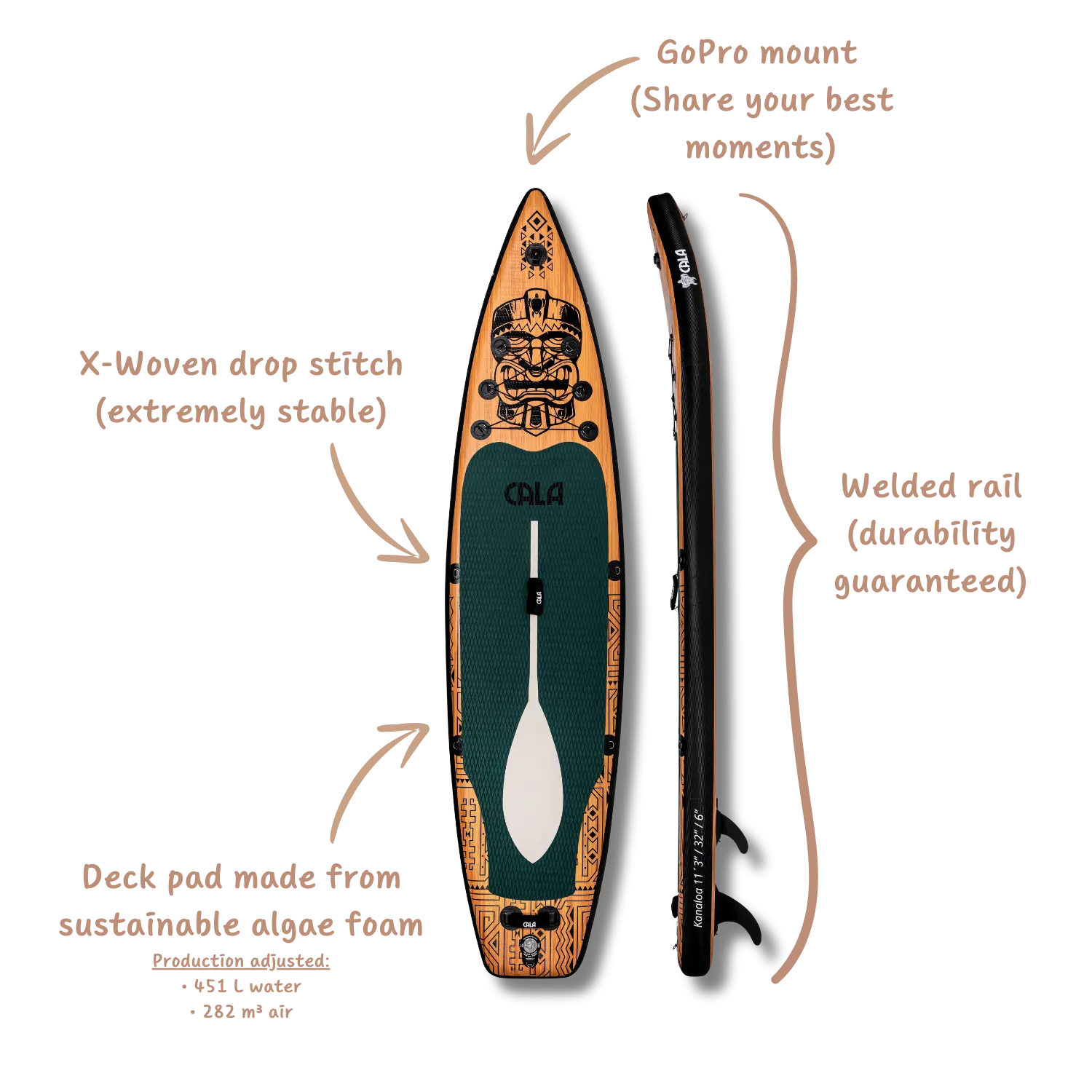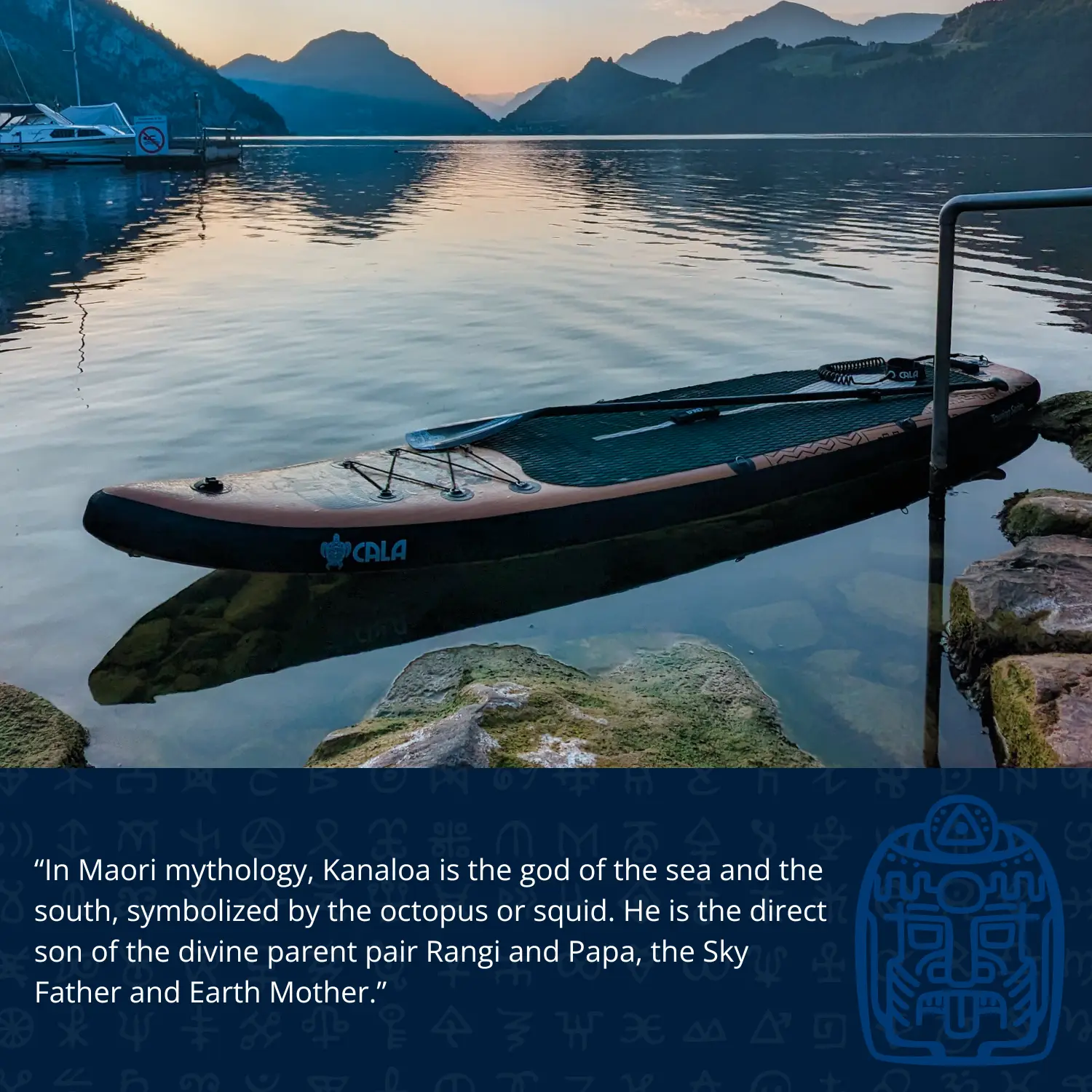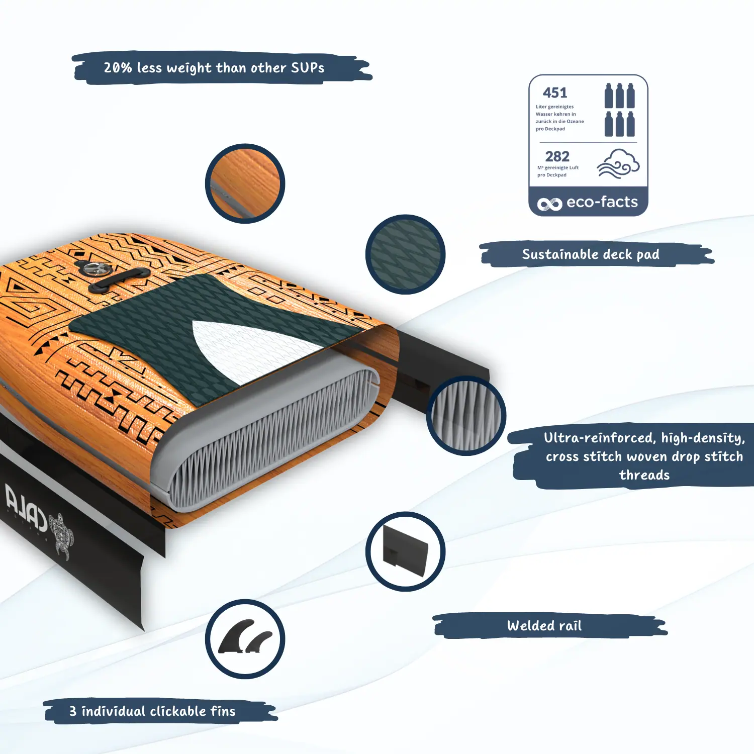 The functional design allows you to glide faster on the water and tackle stronger waves. The surface rests close to the water, allowing you to spend many hours on the board without fatigue. The tip of the board extends well out of the water, enhancing its ability to cut through waves. Kanaloa is perfect for both calm and rough waters. The rich petrol color of the deck pad and the intricate drawings reminiscent of indigenous art make it an absolute eye-catcher.