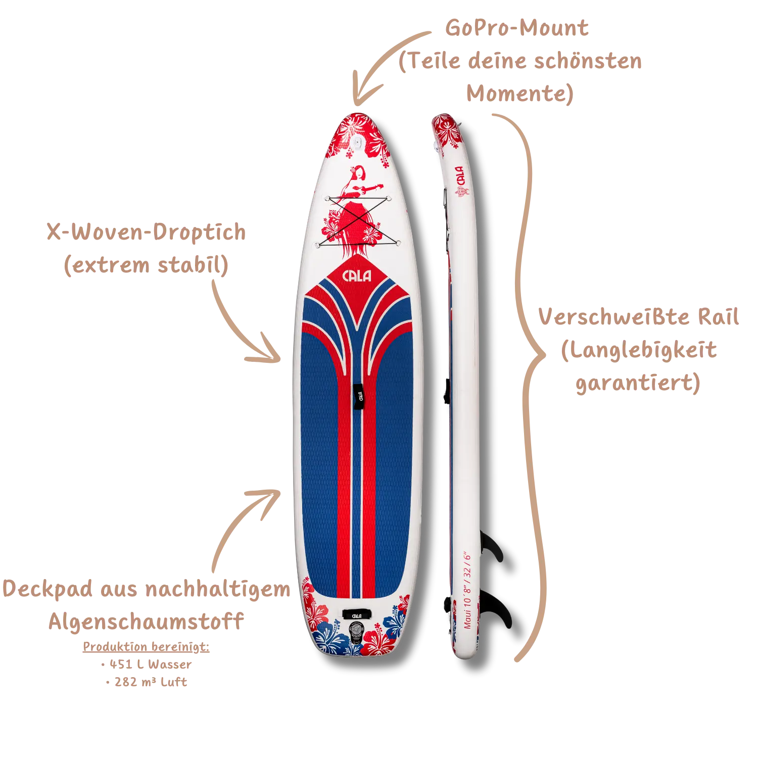 Maui ist das ideale Board für Anfänger und Fortgeschrittene. Es fährt sich leicht, liegt stabil im Wasser und du kannst Kinder oder Hunde sicher auf dem See oder ruhigen Meer mitnehmen.