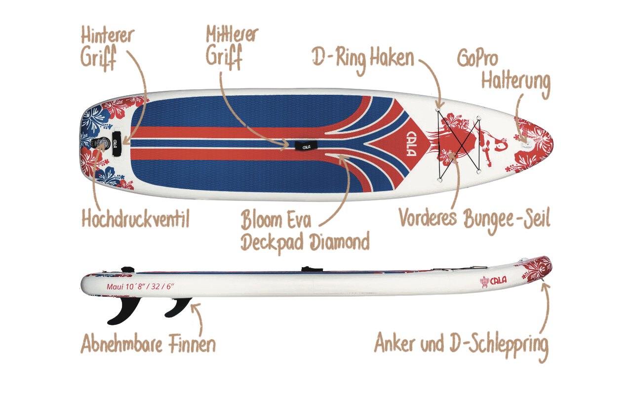 Maui ist das ideale Board für Anfänger und Fortgeschrittene. Es fährt sich leicht, liegt stabil im Wasser, du kannst kleine Kinder oder deinen Hund sicher auf dem See oder ruhigen Meer mitnehmen und die ganze Familie hat ihren Spaß! Das Material ist sehr robust. Die Gestaltung im optimistischen Blumenmuster mit fröhlichem Hulamädchen zaubert einfach jedem ein Grinsen ins Gesicht. Im praktischen Rucksack-Trolley begleitet dich Maui überall dorthin, wo dich dein persönliches Abenteuer erwartet!