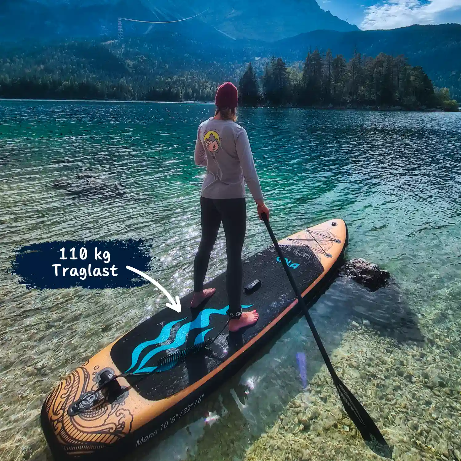 Das Gewicht jedes Boards ist in dessen Beschreibung detailliert aufgeführt. Alle unsere Boards sind robust gebaut, sodass problemlos zwei Personen darauf paddeln können. Sollte das empfohlene Maximalgewicht überschritten werden, ist das Board immer noch ideal für entspannte Fahrten und Spaß auf dem Wasser, eignet sich jedoch nicht mehr für aktive Touren. Wir haben unsere Boards einem Extrem-Belastungstest mit unserem Bulli (ca. 2.5 Tonnen) unterzogen – und können bestätigen, dass sie sehr widerstandsfähig sind.