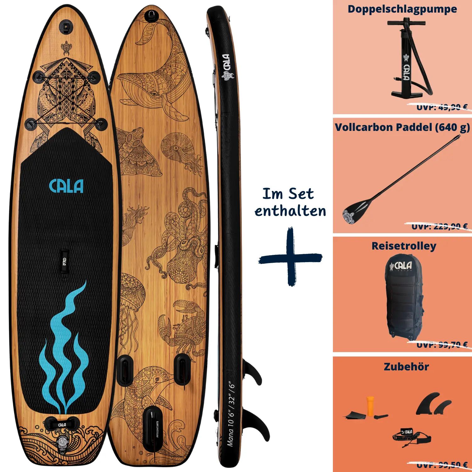 Nein. Unsere Boards werden als Komplettset geliefert. Im Lieferumfang enthalten sind ein Reisetrolley, ein Voll-Carbon-Paddel, ein Repair-Set, eine Pumpe sowie eine Beinbefestigung – alles, was du für dein Abenteuer auf dem Wasser benötigst. Möchtest du Wertsachen oder Verpflegung sicher mitnehmen, empfehlen wir die Anschaffung eines Drybags, um alles trocken zu halten.